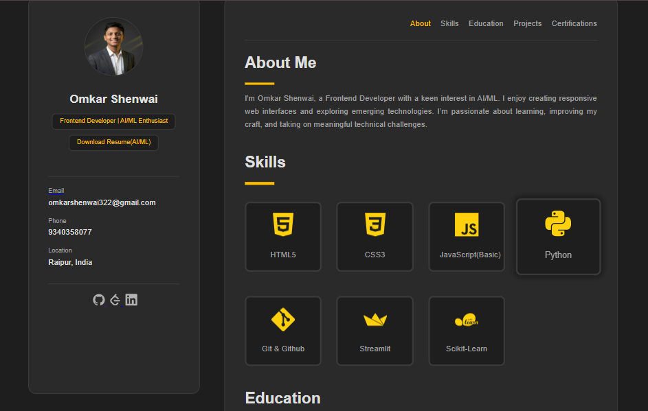 I'm Omkar Shenwai, a Frontend Developer with a keen interest in AI/ML. I enjoy creating responsive web interfaces and exploring emerging technologies. I’m passionate about learning, improving my craft, and taking on meaningful technical challenges.